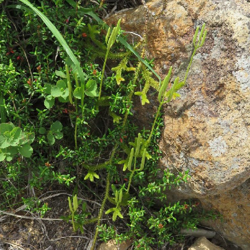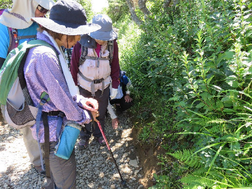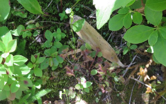 14、この 毛の生えた「つる」のようなものは、 「ヒカゲノカズラ(日影の葛)」、この時期フォークか音叉を立てたような、 「胞子嚢穂」を一杯立てる。大斜面下あたり。 |
