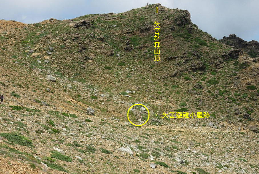 | 13、山頂稜線から 矢筈が森山頂方向、登山道山側の石積みが 矢筈避難小屋跡。 | ||||||||||||||||||||||||||||||||||||||||||||||||||||||||||