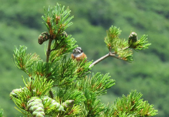10、イワヒバリ、自動焦点のカメラなの、ピントが五葉松に合ってしまった。 鳴き声は 里にいるヒバリと一緒なので、間違えることはない。水道小屋上。 |